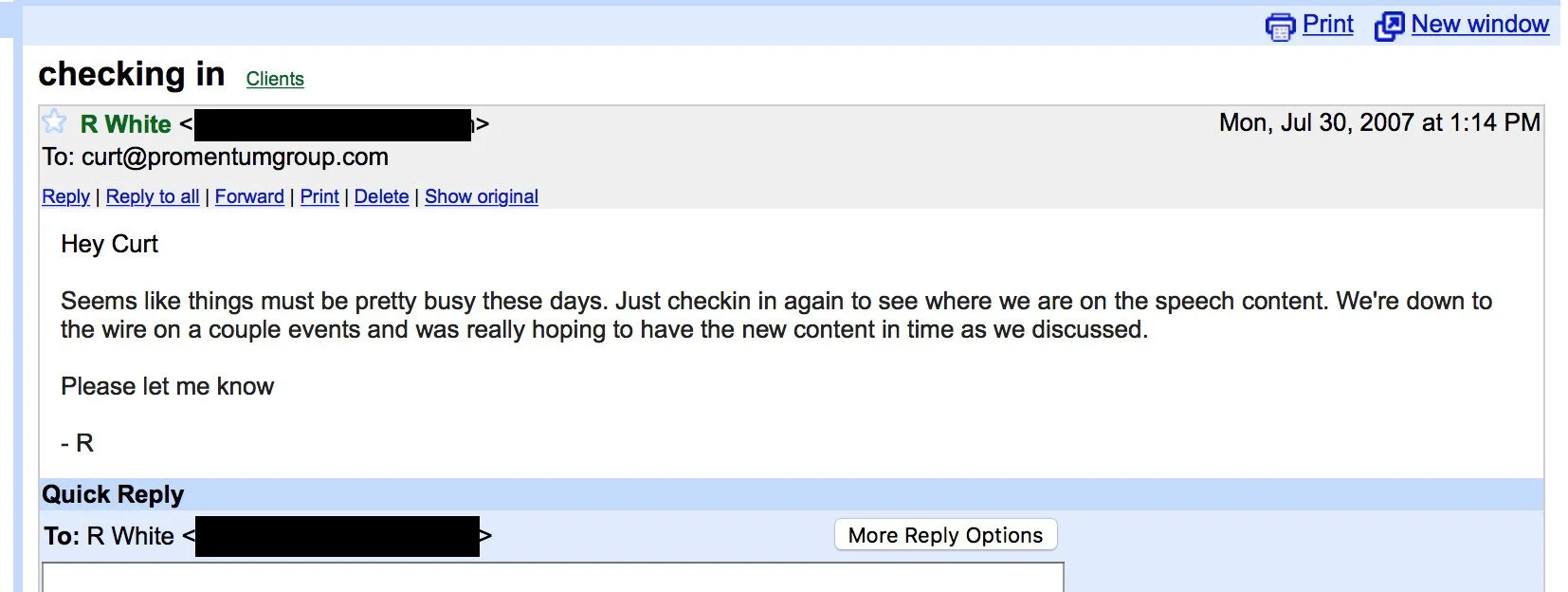 The third “just checking in” email sent from NFL hall-of-fame client (I completely ignored the first two).